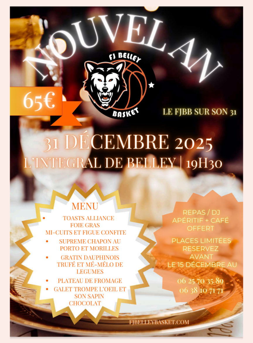 Au programme un repas aux petits oignons et un DJ pour s’ambiancer jusqu’au bout de la Le club de basket belleysan (FJBB) organise une soirée à l’occasion du Nouvel an. Réservations : 06 25 70 35 89 ou 06 38 10 71 71 Plus Décembre 31 (Mercredi) 20 h 30 min - Janvier 1 (Jeudi) 5 h 00 min L'Intégral 422 avenue Hoff Janvier 2026 mer.31dec.jeu.01jan.Soirée du Nouvel anType d'événement:Loisirs Le club de basket belleysan (FJBB) organise une soirée à l’occasion du Nouvel an.