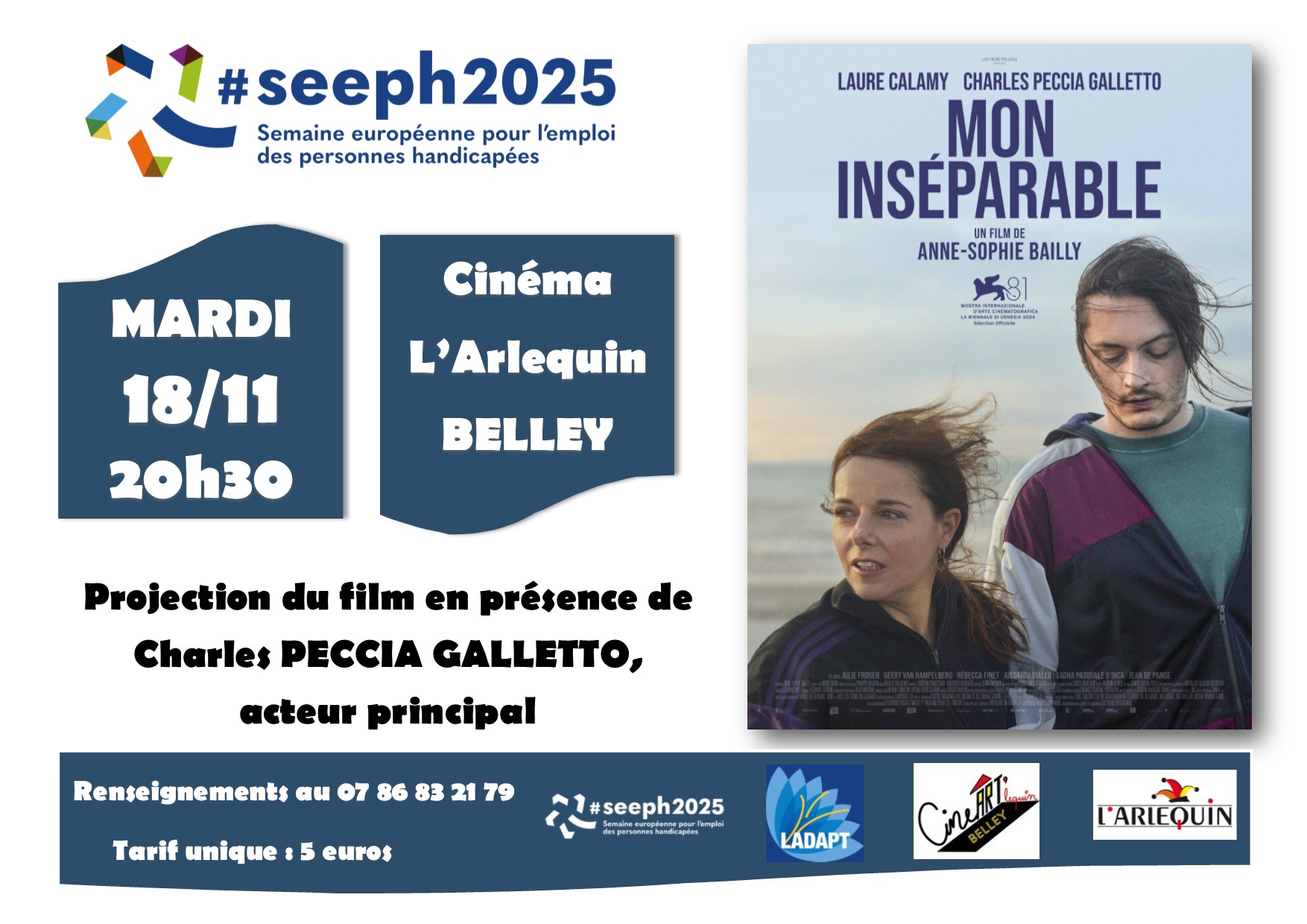 Mardi 18 novembre Dans le cadre de la Semaine européenne pour l’emploi des personnes handicapées, l’Adapt organise une projection du film « Mon inséparable » avec Laure Calamy et Charles Peccia Galletto. Renseignements 07 86 83 21 79 – Tarif unique : 5 € Au préalable, au Pavillon Bellevue : 🕟 17 h 30 – 18 h : Saynètes « perspective emploi et compagnie Rir’APoint ». Plus (Mardi) 20 h 30 min - 22 h 30 min Cinéma l'Arlequin Avenue Alphonse Baudin Jeudi Oui! – Le retour des soirées festives à l’Espace Rameaux