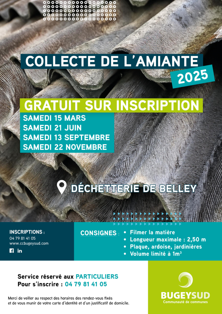 La communauté de communes Bugey-Sud réitère son service de récupération de l’amiante pour les particuliers en 2025 en déchetterie de BELLEY.