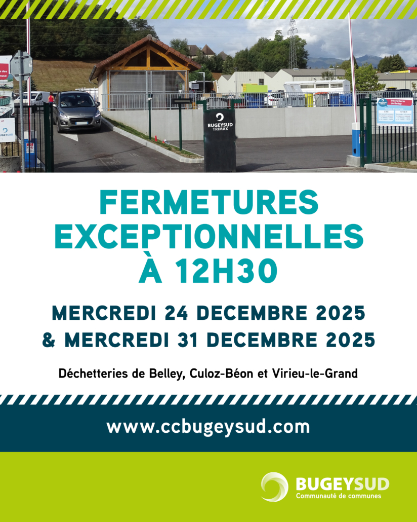 Les déchetteries de Belley, Culoz-Béon et Virieu-le-Grand fermeront exceptionnellement à 12 h 30 les mercredis 24 et 31 décembre 2025.
