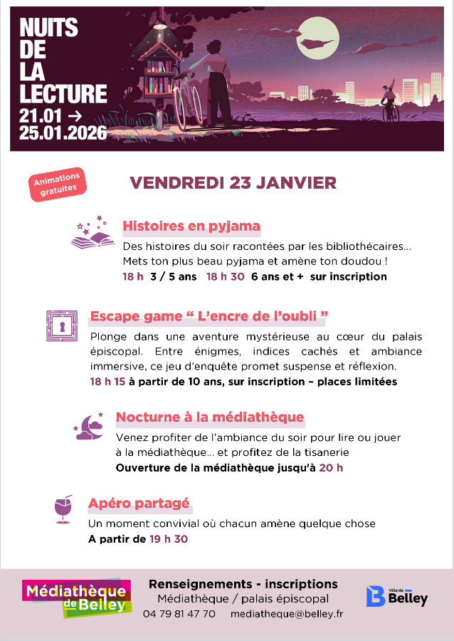 Dans le cadre des Nuits de la lecture, la Ville de Belley et la Médiathèque vous donnent rendez-vous le vendredi 23 janvier pour une soirée conviviale autour du livre, du jeu et du partage.