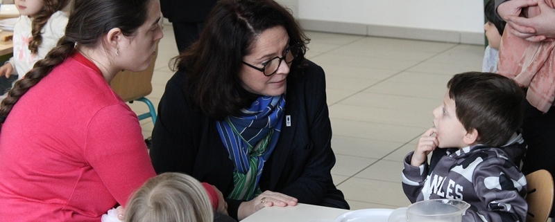 Marina Ferrari, ministre des Sports, de la Jeunesse et de la Vie associative, a été accueillie à Belley lundi 16 février. Au programme, la visite de l’accueil de loisirs situé à l’école Jean-Ferrat. Un bouquet de fleurs en papier, spécialement confectionné pour l’occasion par les petites mains, a été remis à la ministre.